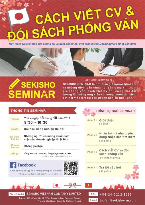 Việt Nam với những lợi thế của mình trở thành điểm đến đầu tư hấp dẫn của các nhà đầu tư thế giới nói chung và Nhật Bản nói riêng. Nhà trường phối hợp với công ty Sekisho Việt Nam tổ chức buổi hội thảo chia sẻ kinh nghiệm phỏng vấn, kỹ năng mềm, cách viết CV... ứng tuyển vào các Công ty Nhật Bản tại Việt Nam.